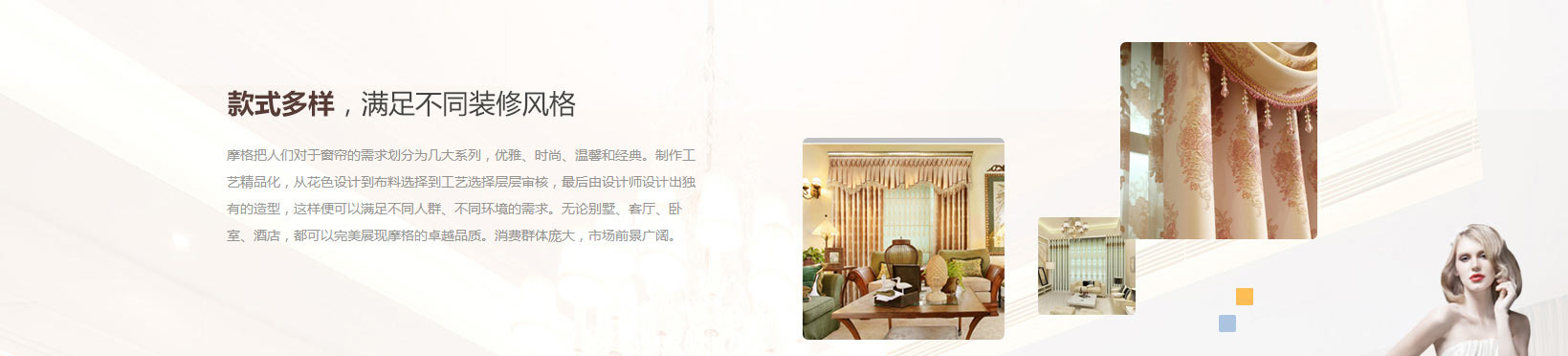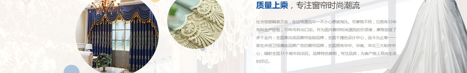 取源于中華悠久紡織文化的摩格(MOONGOOL)品牌,始終堅(jiān)持“健康、時(shí)尚、精致”的產(chǎn)品觀,引領(lǐng)軟裝布藝行業(yè)進(jìn)入高品質(zhì)生活。產(chǎn)品設(shè)計(jì)風(fēng)格融入歐式低調(diào)奢華元素及國(guó)際流行時(shí)尚趨勢(shì),先后開(kāi)發(fā)了古典巴洛克、簡(jiǎn)約洛可可、經(jīng)典中式(新中式)、時(shí)尚地中海、浪漫田園、唯美美式、原木風(fēng)、奶油風(fēng)、現(xiàn)代簡(jiǎn)約風(fēng)九大風(fēng)格系列產(chǎn)品,擁有各種花型、工藝、材料面料達(dá)1500余種。其中窗簾產(chǎn)品作為摩格核心產(chǎn)品頗受消費(fèi)者青睞。采用高精密、棉麻、雪尼爾等上千種布料的摩格窗簾用高端的新興工藝制作,絨面柔軟,織物華麗,九大截然不同的風(fēng)格同時(shí)搭配種類(lèi)繁多的布類(lèi)花型和不同的制造工藝,顏色或艷麗或素雅或大氣,簡(jiǎn)約而不簡(jiǎn)單。無(wú)論哪一款窗簾,都在注解不一樣的故事,也詮釋著自己的絕佳格調(diào)。正因?yàn)槿绱耍瑐€(gè)性獨(dú)特和創(chuàng)新思維賦予摩格更多的市場(chǎng)商機(jī)。